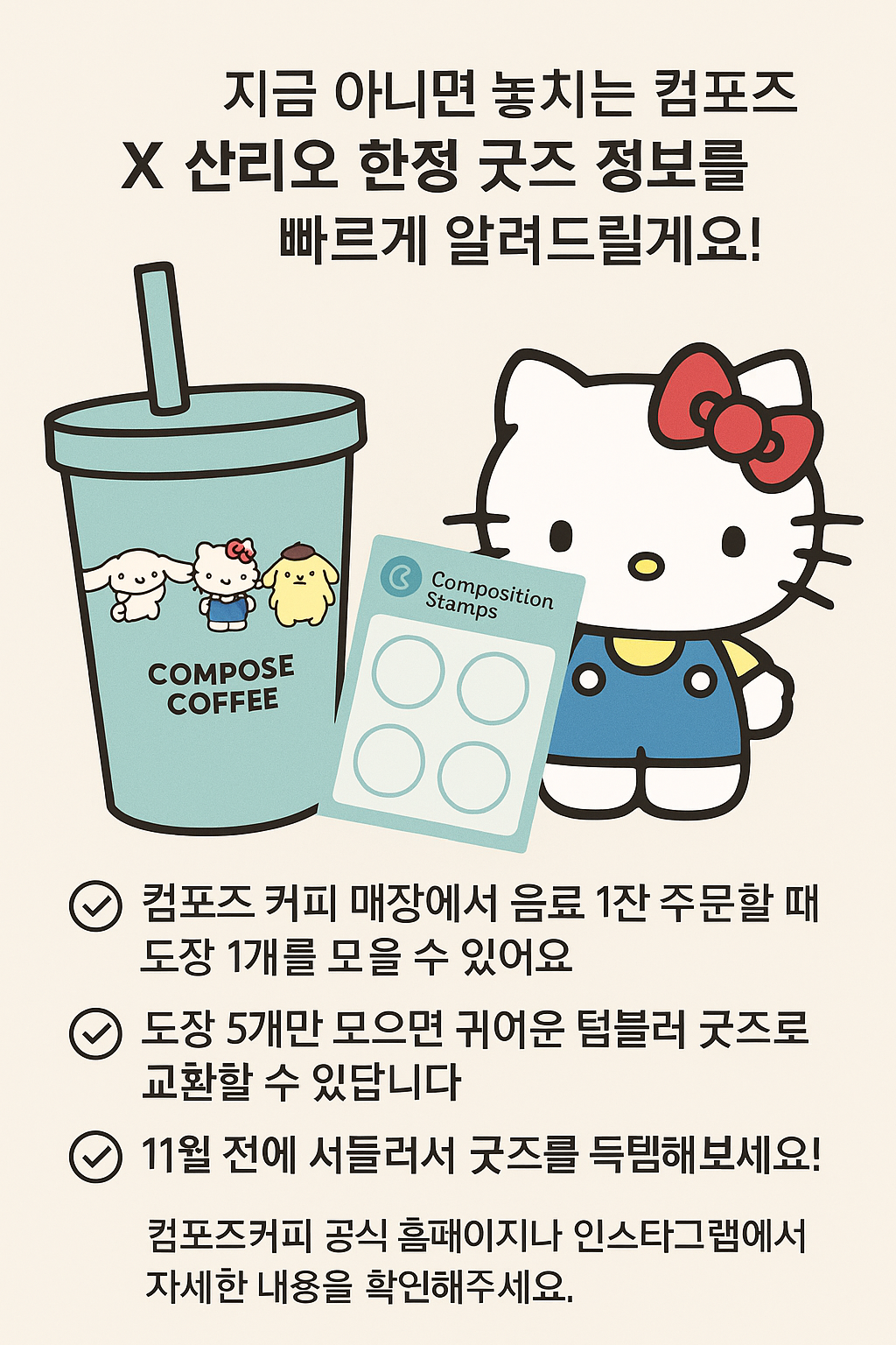 요즘 컴포즈커피와 산리오 캐릭터 콜라보가 SNS에서 난리입니다! 단순 굿즈를 넘어서 한정 캐릭터 컵, 텀블러, 도장 이벤트까지 진행 중이죠. 지금 바로 참여하지 않으면 놓칠 수 있어요!