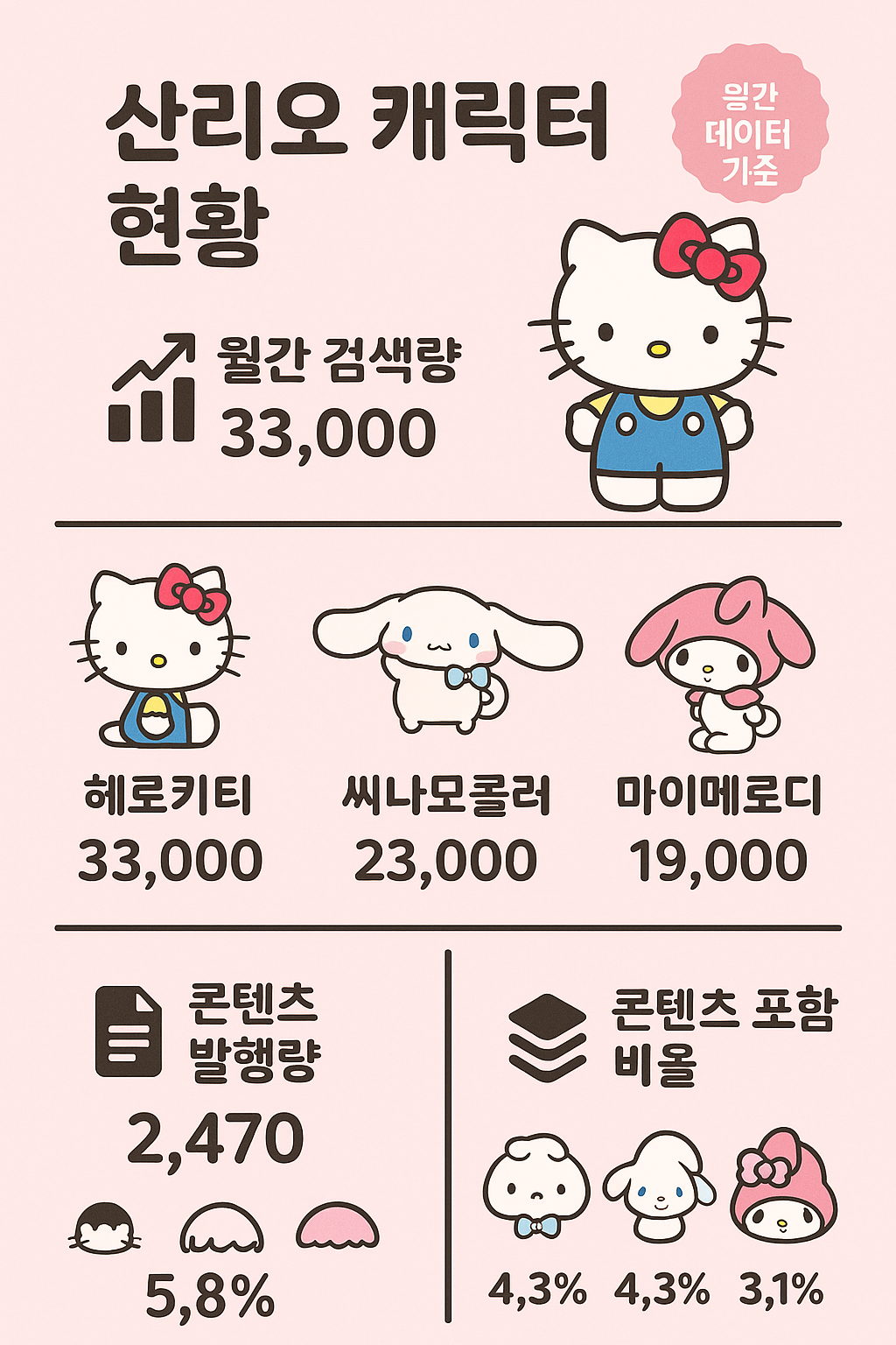 “컴포즈 산리오” 키워드 검색량은 월 33,000건 이상으로 꾸준히 높은 관심을 받고 있어요. 콘텐츠 수도 적기 때문에 지금 상위 노출을 노릴 수 있는 좋은 시점입니다.