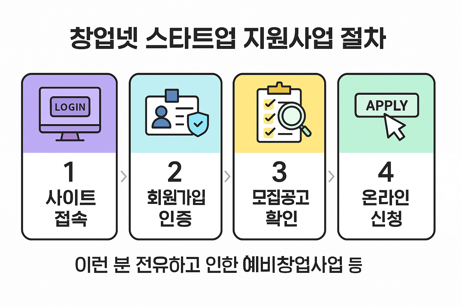 - 예비창업자 지원: 최대 1억 원의 창업 자금 + 창업 교육 + 전담 멘토링